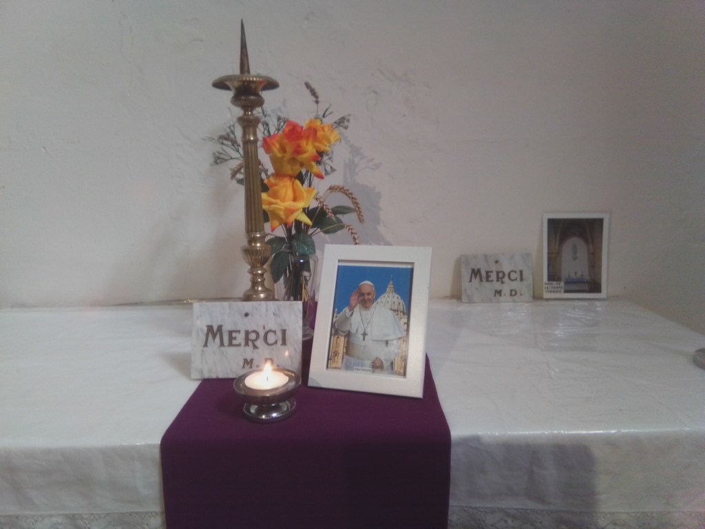 Une photo du pape François y est exposée, accompagnée de lumignons, que chacun peut allumer en signe de prière et d’espérance.