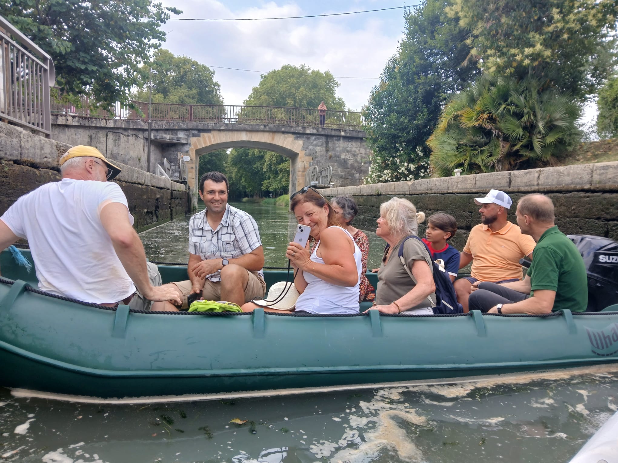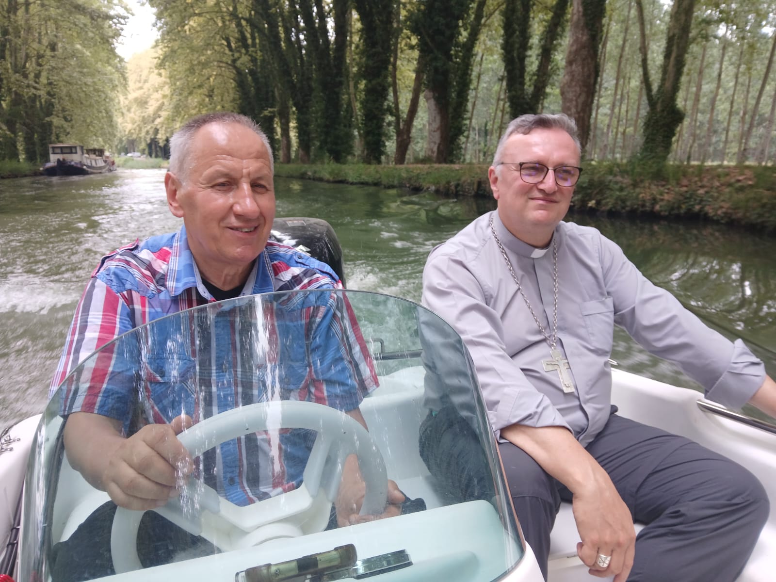 À bord du bateau du Père Ioan, le cortège a repris la route… sur l’eau ! Du canal de Garonne jusqu’après l’écluse du Mas, les pèlerins ont pu reposer leurs pieds et échanger entre eux, bercés par le clapotis régulier. Admirer la nature depuis le ponton a donné à la marche une saveur d’Évangile sur le lac : « Passons sur l’autre rive » (Mc 4, 35).