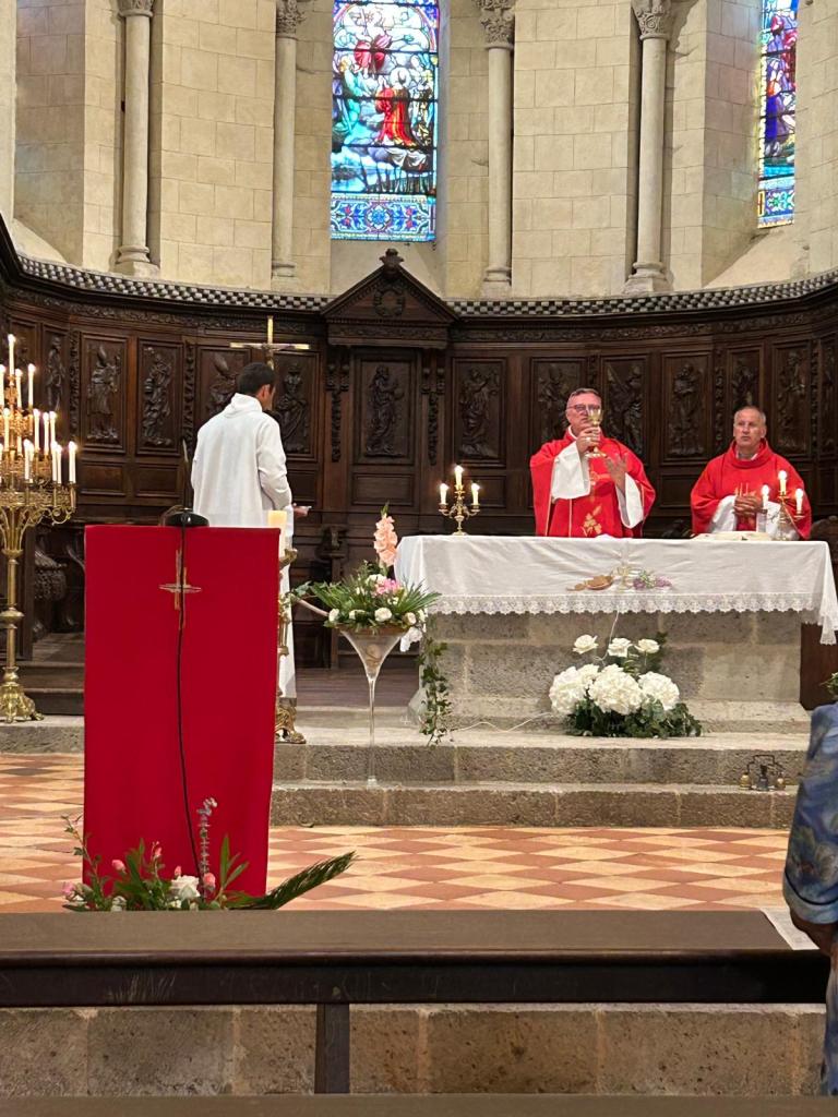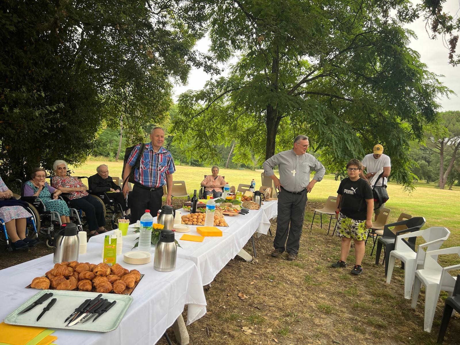 En fin d’après-midi, accompagné du Père Ioan et de M. Petit, Monseigneur de Bucy s’est rendu à la maison de retraite : bénédiction d’une chambre, parole d’encouragement pour les résidents. Pendant ce temps, les bénévoles dressaient au Mas d’Agenais le grand apéritif dînatoire convivial qui a suivi la messe solennelle – magnifiée par la chorale et deux organistes.