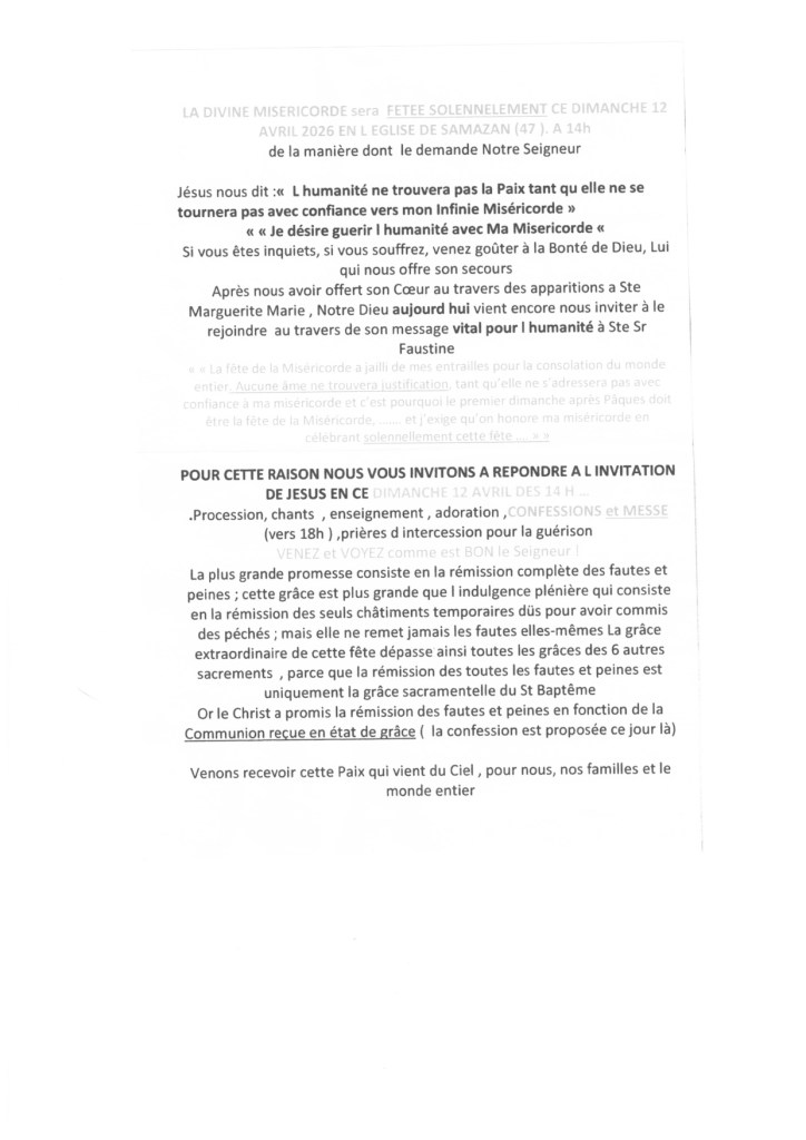 Le dimanche 12 avril 2026, la paroisse Saint-Vincent de Garonne invite l’ensemble des fidèles à célébrer solennellement la fête de la Divine Miséricorde en l’église de Samazan. Répondant à l’appel de Notre Seigneur transmis à Sainte Faustine, cette journée est une invitation à se tourner avec une confiance totale vers Son Infinie Miséricorde.